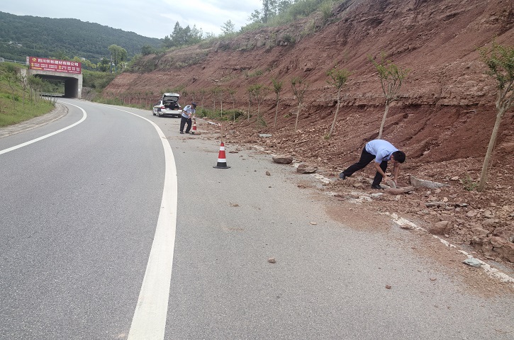 7月3日下午,G108线K1949+430处护坡碎石滑落到路面,影响过往车辆通行安全,正在此路段巡查的剑阁县交通运输综合行政执法大队发现后,紧急将执法车辆停在事发路段,提醒过往车辆注意安全,迅速设置警示标识,保障车辆安全通行。
