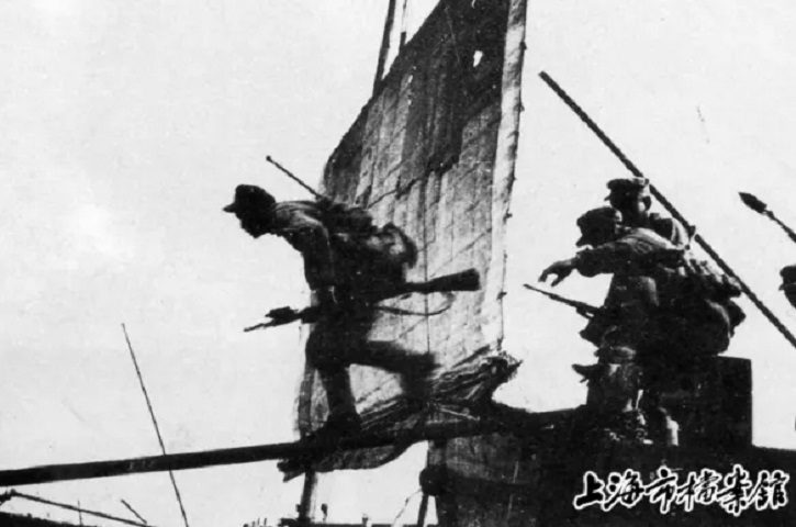 渡江战役中解放军冒着敌人的炮火渡江。(上海市档案馆提供)新华社发