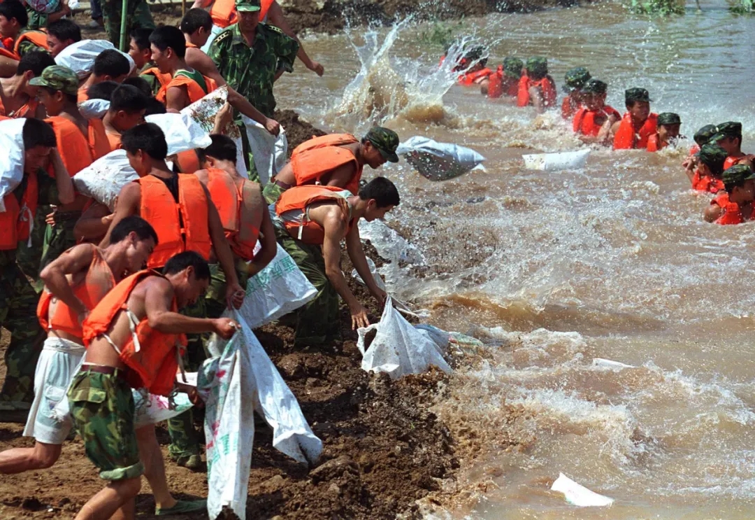 1998年8月11日,湖北石首久合垸乡团山河支堤出现“管涌”险情,解放军官兵立即奔赴险段,以血肉之躯挡住肆虐的洪水,减低洪水的冲击力,同时加固堤防。李刚 摄