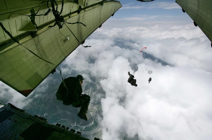 15名空降兵从地震灾区茂县上空4999米的高空奋不顾身地跳下,进入道路阻断的地震灾区参加救援(2008年5月14日摄)。新华社发