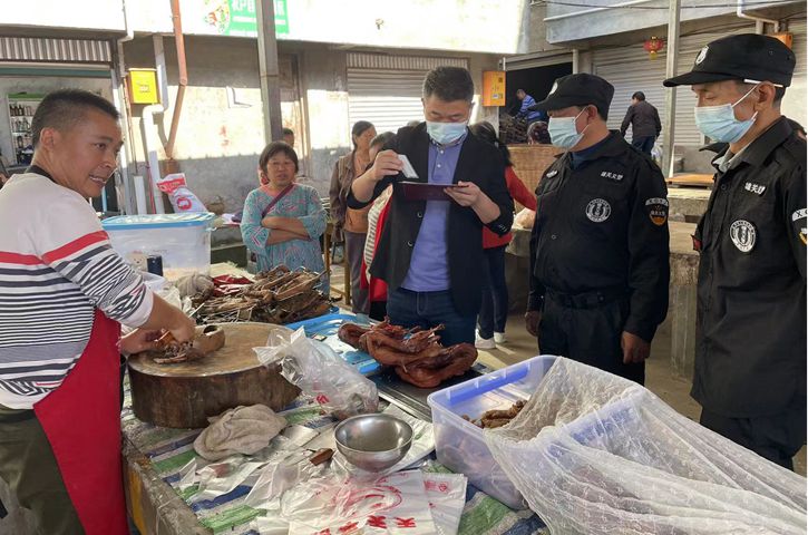 检查过程中,李明隆同志对西庙场镇各经营单位场所码一一扫码查验,对农资进出货台账、冷冻食品登记台账、餐饮服务单位废弃物管理台账等查看指导并了解宴席备案情况,对农贸市场从业人员资质进行核查并详细查看了解月饼等节日食品生产日期等基本情况,对违规载人三轮车、不戴头盔摩托车进行交通安全劝导。