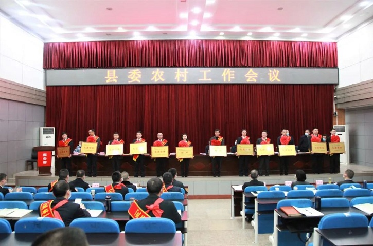 在县委农村工作会议阶段,会议传达学习了中央和省委、市委农村工作会议精神,通报了2021年产业振兴“大比武”情况,表扬了2021年度“三农”工作先进集体和先进个人,命名了2021年实施乡村振兴战略县级先进乡镇、示范村。集中听取了与会代表的经验交流和表态发言。杨祖斌等县领导向受表扬的先进代表颁奖“授旗”,给予工作后进“黄牌”警示,更加鲜明“以实绩论英雄、以结果看能力”工作导向。
