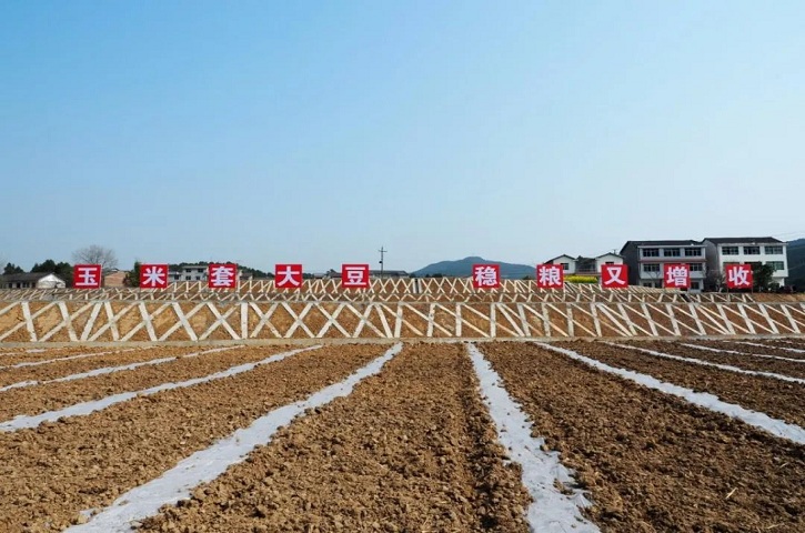 站在公兴镇宝龙村田埂边,远远望去,一条条覆盖好的地膜宛如长龙有序俯卧在田间,“玉米套大豆 稳粮又增收”的标语格外醒目。随着隆隆机声,两台机械分别演示了大豆玉米套作和间作的种植技术。