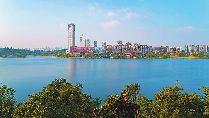 四川天府新区兴隆湖以及湖畔的西部(成都)科学城(2021年10月29日摄)。新华社发(四川天府新区融媒体中心供图)