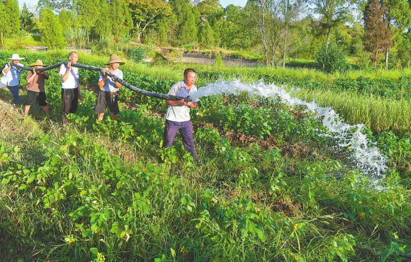8月22日晨,广安市广安区恒升镇梓潼村党员干部和村民,在大豆基地浇水抗旱。张国盛 摄(视觉四川)