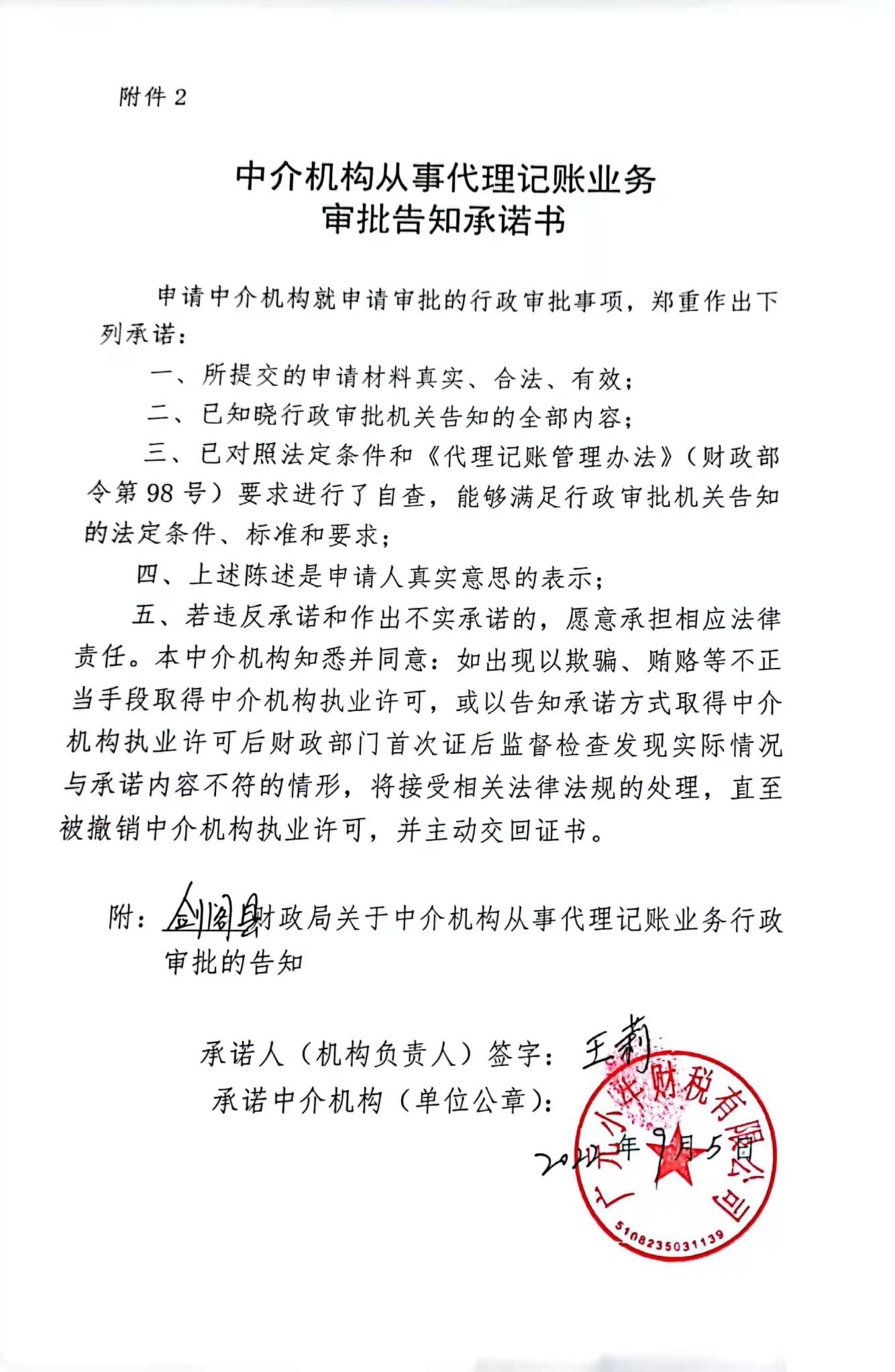 现将剑阁县敏思捷企业管理有限公司、剑阁县众星企业管理有限公司、广元小牛财税有限公司提供的《中介机构从事代理记账业务审批告知承诺书》予以公示。如对公开事项有异议,请与剑阁县财政局法规会计股联系。联系电话:0839-6601886。