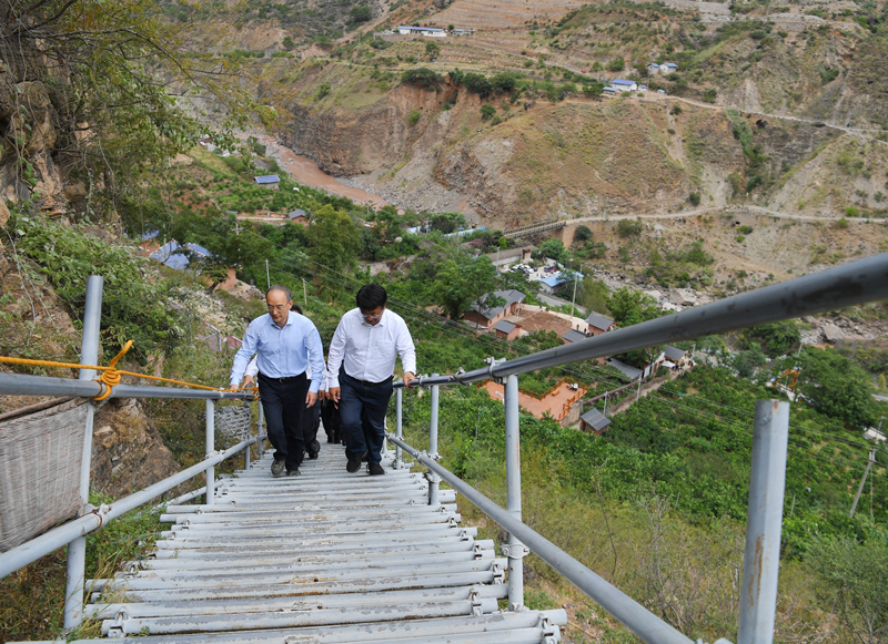 9月20日,省委副书记、省长黄强在昭觉县古里镇阿土列尔村,登上通往村寨的钢梯,听取村民讲述从藤梯到钢梯再到楼梯的巨大变迁。