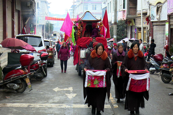2月22日上午,文昌巡游活动拉开了本届庙会的序幕,村民与演职人员打着锣鼓,扛着彩旗,舞着龙狮,在大街上穿梭,他们个个精神抖擞、意气风发,沿香沉寺至会龙庙,途经场镇大街小巷,家家户户都以鞭炮相迎,以示吉祥,整个场镇鞭炮隆隆,锣鼓喧天。在宽敞的十字街头,巡游队伍表演了传统的花灯、龙灯、钱夹、裸戏、地方川戏等节目,最显眼的是来自香沉镇跃进社区的“文艺表演队”、原乘风村的“花灯”在销声匿迹50年后经过乘风村的重新包装下,再次登台亮相,成为了庙会上一道亮眼的风景。活动现场里外三层,人潮涌动,热闹非凡。