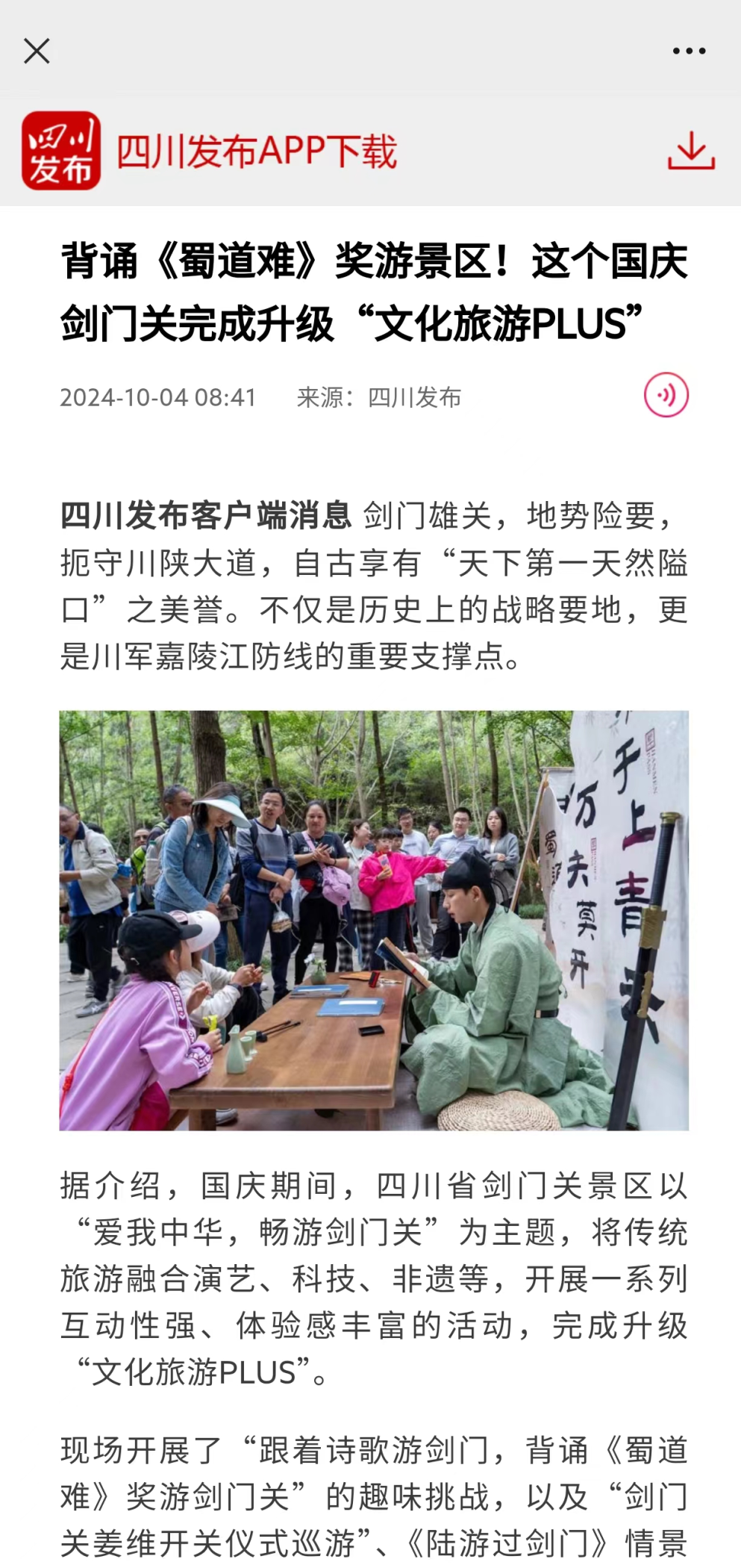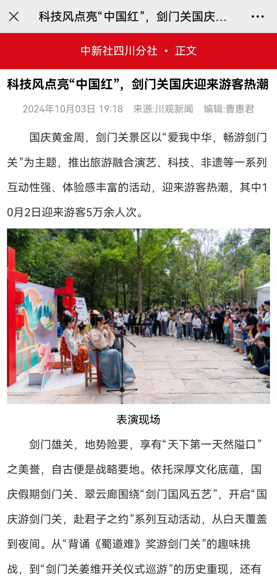 国庆假期期间,剑门关精彩的文旅活动受到了多家媒体的关注,包括央视新闻、四川发布、川观新闻、中国青年网四川、中新社四川、成都日报锦观、成都电视台看度、封面新闻、凤凰新闻等在内的多家传统媒体聚焦剑门关,并为剑门关点赞!