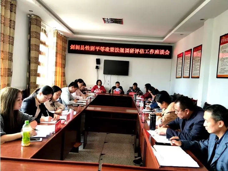 现场调研结束后,全体人员在普安镇四楼会议室召开了剑阁县开展性别平等政策法规问题调研评估座谈会。会上,县委组织部、县检察院、县民政局等部门就推动建立法律政策性别平等评估机制的情况、梳理性别平等评估应关注重点问题等进行了交流发言。