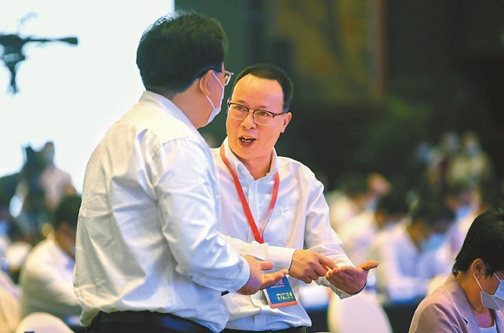 交流首届中国数字碳中和高峰论坛开始前,与会嘉宾互相交流。