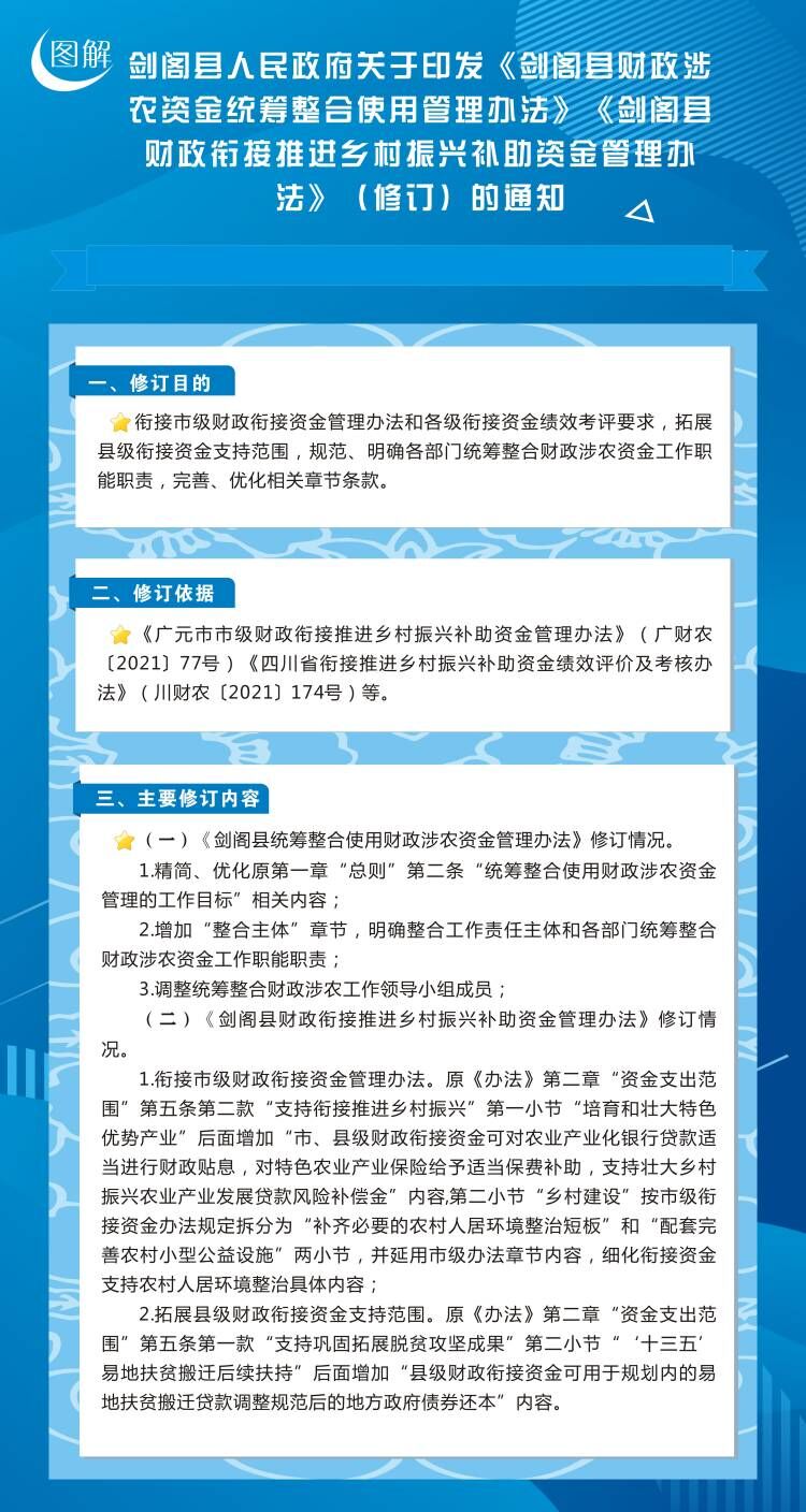 图解:剑阁县人民政府关于印发《剑阁县统筹整合使用财政涉农资金管理办法》《剑阁县财政衔接推进乡村振兴补助资金管理办法》(修订)的通知