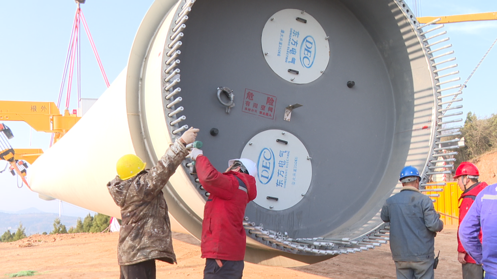 在江口镇高堂村,省重点项目中节能广元市剑阁三期项目土建工程已全面完成,眼下,正在进行风力发电机组叶片吊装。在工作人员的熟练操作下,总长96米,重达26吨的叶片正缓缓吊起,精准地安装到轮毂变桨轴承上。像这样一台风力发电机组,大概需要两天就可以完成。
