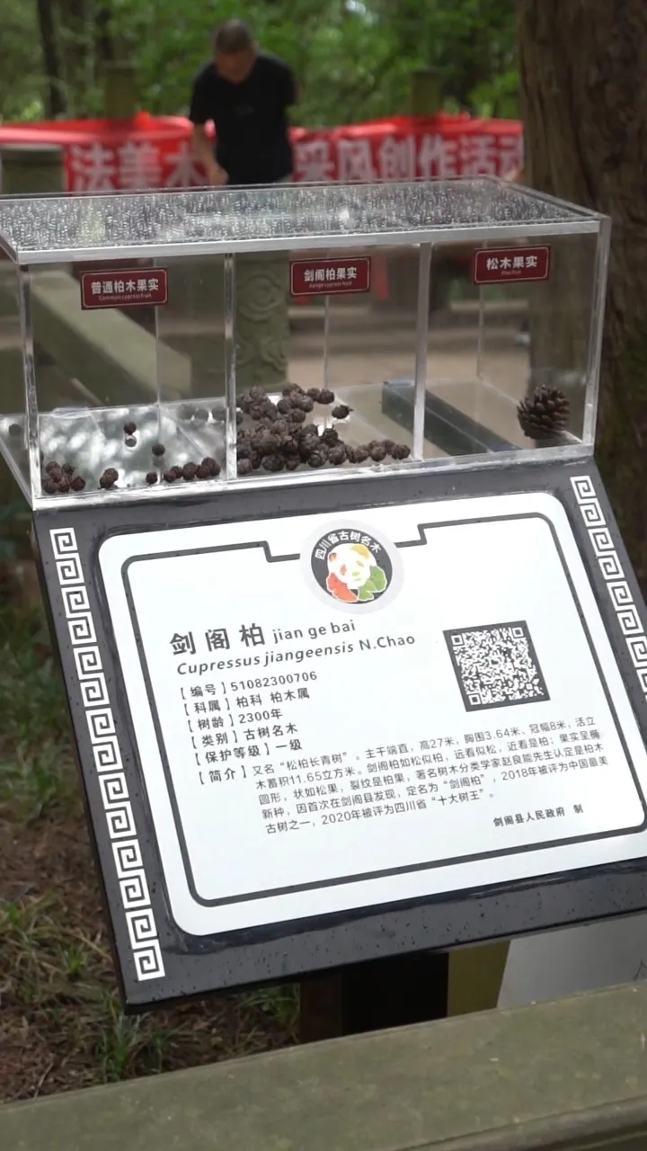 这株独一无二的剑阁柏,树龄高达2300年。树高27米,笔直挺拔、直指云霄。“剑阁柏”奇特之处不仅在于树龄,还在于其独一无二的特点:远看似松、近看是柏。尤其是其果实,大于普通柏果但小于松果。果实呈椭圆形,与松果相似,而普通柏树果实呈圆形,但从裂纹上看又与柏果相似。