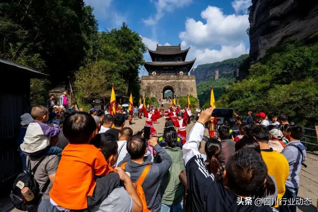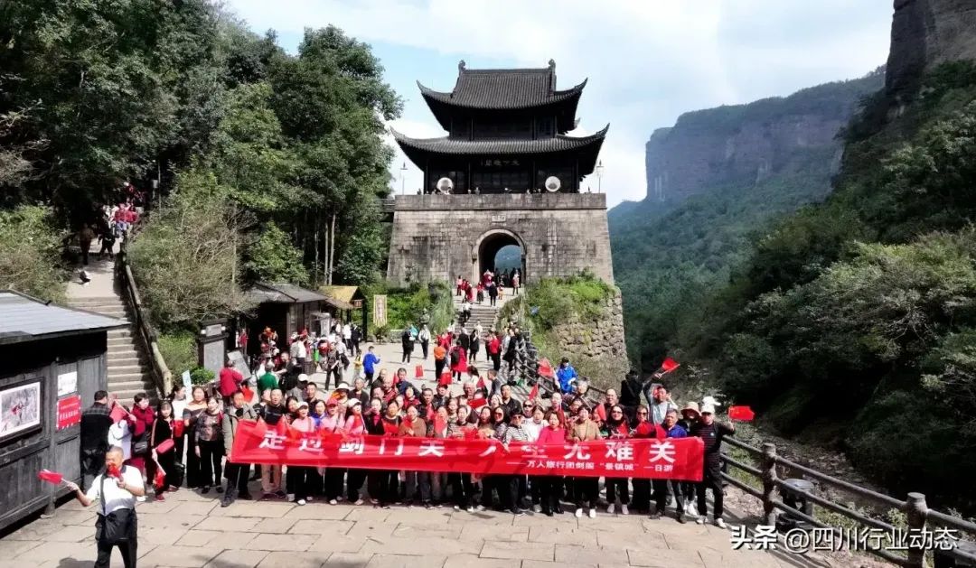 10月7日,国庆假期的最后一天,四川省剑阁县剑门关景区热度持续不断,迎来了历史性的一刻,成功接待了史上最大的旅游团队。来自成都、绵阳、广元、巴中以及陕西等地的近万名游客齐聚一堂,共同参与“万人旅行团 秋游剑门关——走进剑阁‘景城镇’一日游”活动,为国庆假期画上了一个圆满的句号。