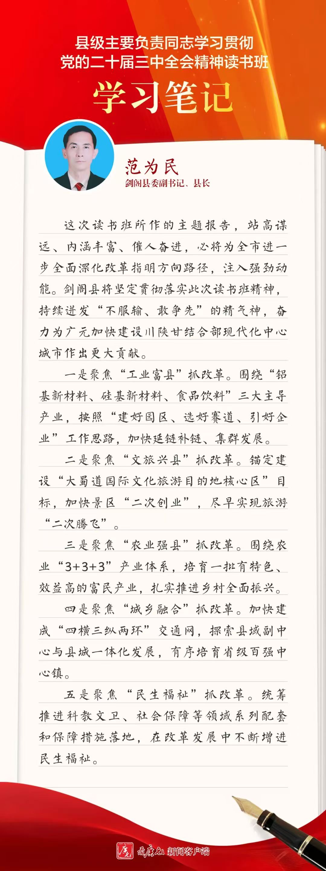 读书班学习笔记|剑阁县委副书记、县长 范为民:勇担改革使命 奋力为广元现代化建设贡献剑阁力量