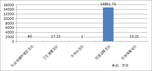 2019年一般公共预算财政拨款支出14924.16万元,主要用于以下方面:社会保障和就业支出208(类)40万元,占0.27%;卫生健康支出210(类)17.21万元,占0.12%;农林水支出213(类)2万元,占0.01%;交通运输支出214(类)14851.75万元,占99.51%;住房保障支出221(类)13.21万元,占0.09%。