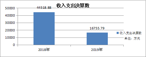 2019年度收、支总计16755.79万元。与2018年相比,收、支总计各减少27763.09万元,下降62.36%。主要变动原因是2019年公用经费、项目资金预算减少。