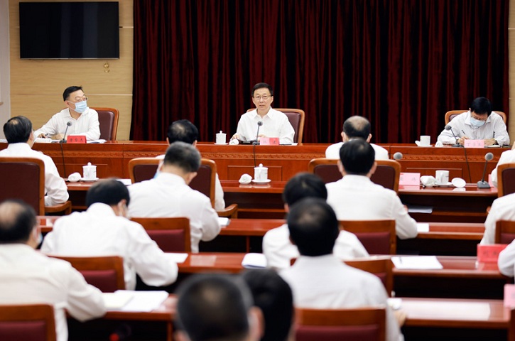 6月7日,中共中央政治局常委、国务院副总理韩正在国家粮食和物资储备局主持召开座谈会。新华社记者 丁林 摄
