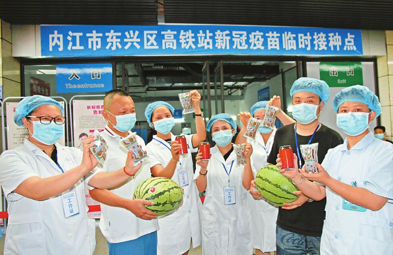 八月三日,在内江市东兴区高铁站新冠疫苗接种点,工作人员捧着医院送来的中药、西瓜和清凉饮料互相加油鼓劲。李建明 摄