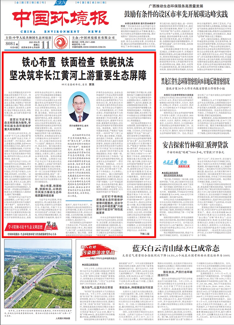 8月11日出版的《中国环境报》在头版头条,发表了四川省委副书记、省长黄强的署名文章《铁心布置?铁面检查?铁腕执法?坚决筑牢长江黄河上游重要生态屏障》,全文转载如下。