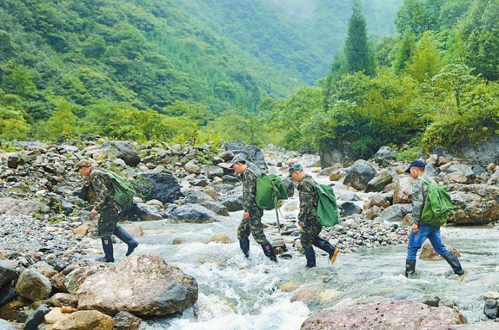 8月25日,大熊猫国家公园四川片区大邑区域,大蒜坪管护站的巡护队员在渡河。新华社记者 高搏扬 摄