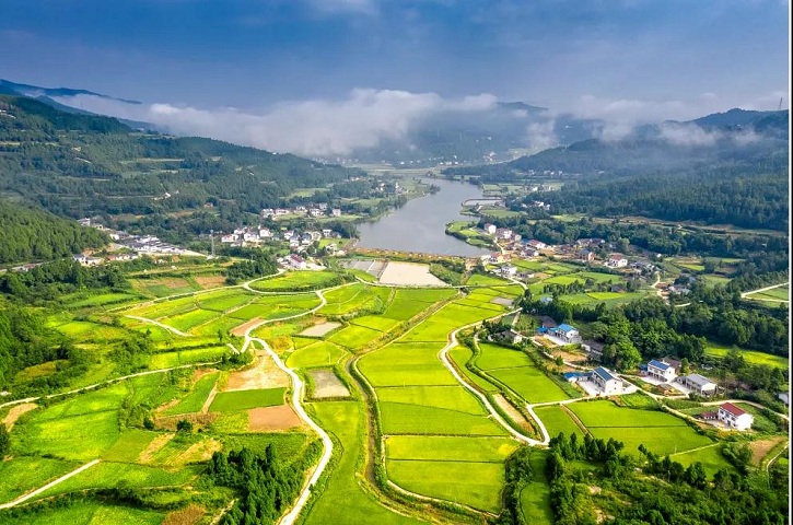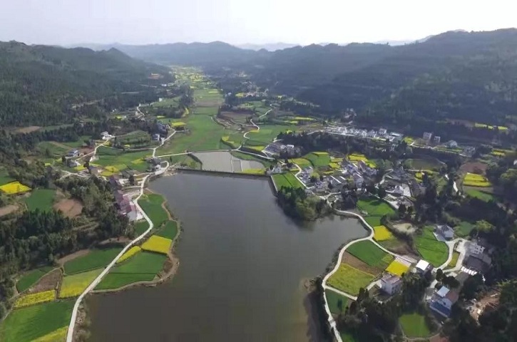 在剑阁县东南部,不羁的圈龙河从杨村镇官店村发源,一路向西南挺进,从白溪浩河汇入奔腾的嘉陵江。在发源地,圈龙河从官店村穿村而过,“一条圈龙河,两村隔岸愁”,这是过去对官店村和长湖村最真实的写照。而今沿着圈龙河往下走,秋风拂过,传来阵阵稻香,1900亩高标准农田喜获丰收,老百姓打谷子、逮鱼、摘石榴,宽广的田野一派丰收景象。