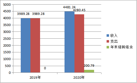 2020年度收入总计4481.24万元,支出总计4280.45万元,年末财政结转200.79万元。与2019年相比,收入总计增加491.96万元,增长12.33%,支出总计增加291.17万元,增长7.30%,主要变动原因是教职工人员增加,工资增长。