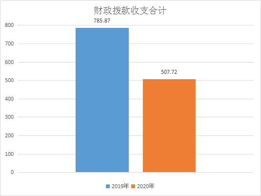 2020年财政拨款收、支总计507.72万元。与2019年相比,财政拨款收、支总计各减少278.15万元,下降35.39%。主要变动原因是2019年有331.9万元的项目经费,用于乡镇存量垃圾治理,再加上人员变动导致此情况。
