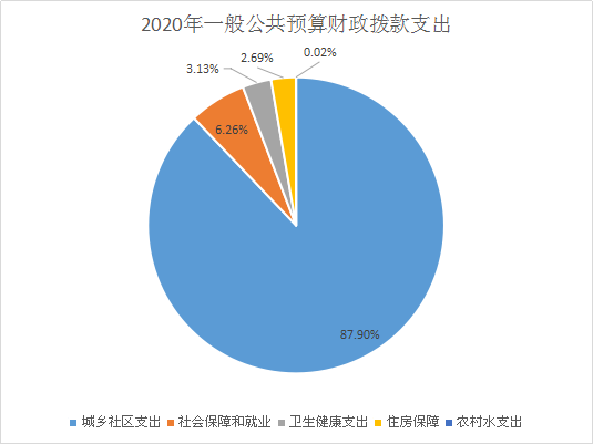 2020年一般公共预算财政拨款支出482.11万元,主要用于以下方面:城乡社区支出(类)支出423.78万元,占87.9%;社会保障和就业(类)支出30.2万元,占6.26%;卫生健康支出(类)15.1万元,占3.13%;住房保障(类)支出12.97万元,占2.69%;农村水支出(类)支出0.06万元,占0.02%。