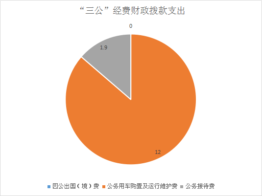 2020年“三公”经费财政拨款支出决算中,因公出国(境)费支出决算0万元;公务用车购置及运行维护费支出决算12万元,占86.33%;公务接待费支出决算1.9万元,占13.67%。具体情况如下: