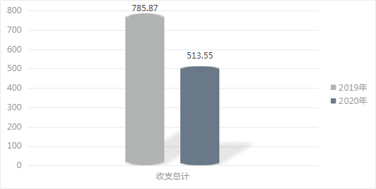 2020年度收、支总计513.55万元。与2019年相比,收、支总计各减少272.32万元,下降34.65%。主要变动原因是2019年有331.9万元的项目经费,用于乡镇存量垃圾治理,再加上人员变动导致此情况。