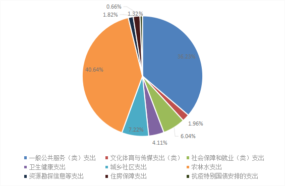 2020年一般公共预算财政拨款支出1215.02万元,主要用于以下方面:一般公共服务(类)支出440.24万元,占36.23%;文化体育与传媒支出(类)23.78万元,占1.96%;社会保障和就业(类)支出73.38万元,占6.04%;卫生健康支出49.97万元,占4.11%;城乡社区支出87.78万元,占7.22%;农林水支出493.73万元,占40.64%;资源勘探信息等支出16.09万元,占1.32%;住房保障支出22.06万元,占1.82%;抗疫特别国债安排的支出8.00万元,占0.66%。