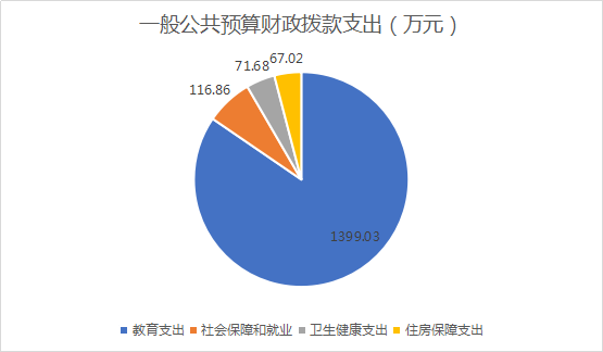 2020年一般公共预算财政拨款支出0万元,主要用于以下方面: 020年一般公共预算财政拨款支出1654.58万元,主要用于以下方面:一般公共服务(类)支出0万元,占0%;教育支出(类)1399.03万元,占84.55%;科学技术(类)支出0万元,占0%;文化旅游体育与传媒(类)支出0万元,占0%;社会保障和就业(类)支出116.86万元,占7.06%;卫生健康支出71.68万元,占4.33%;住房保障支出67.02万元,占4.06%。