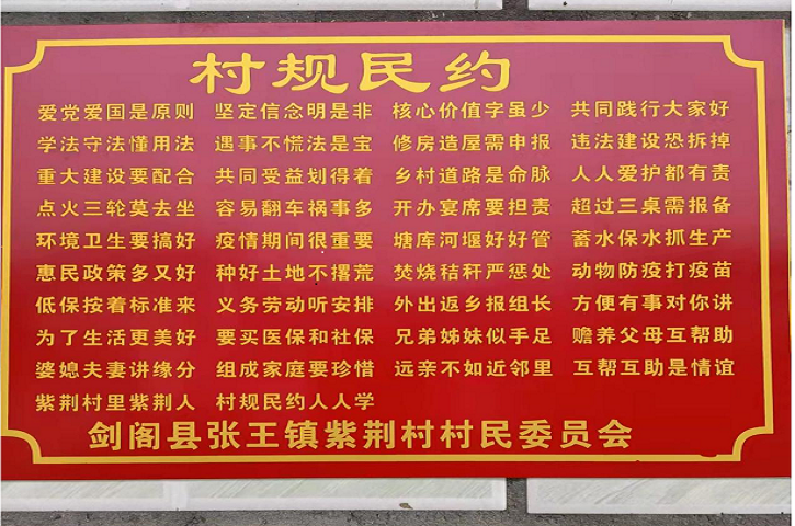 坚持四大原则。民主性原则。监督权、参与权是广大群众与生俱来的渴望,只不过以往工作中缺乏有效途径。紫荆村村组干部通过广播、微信群、挨家挨户走访、宣传,广泛征集、收集群众意见,让村规民约在阳光下制定,实现村规民约大家约。合法性原则。村规民约制定工作,全程邀请法律顾问参与把关,确保程序合法、结果合法。针对性原则。通过充分调研、总结出村务推进中的的五大类病症(农村留守人群老龄化、法纪意识淡薄、团结意识不强、不关心各项政策、参与村务激情不高),围绕这些难点、重点问题,有针对性的纳入约定。实用性原则。形式上采用简洁的文字,通俗易懂的语言,让村民不自知的就记住内容,传唱千里。