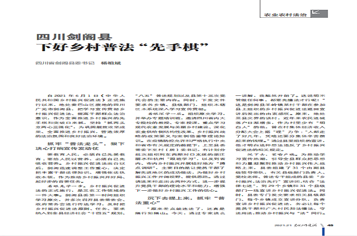 近日,剑阁县委书记杨祖斌在农业农村部主管的《农村工作通讯》“农业农村法治”栏目,发表了题为《四川剑阁县:下好乡村普法“先手棋”》的署名文章。
