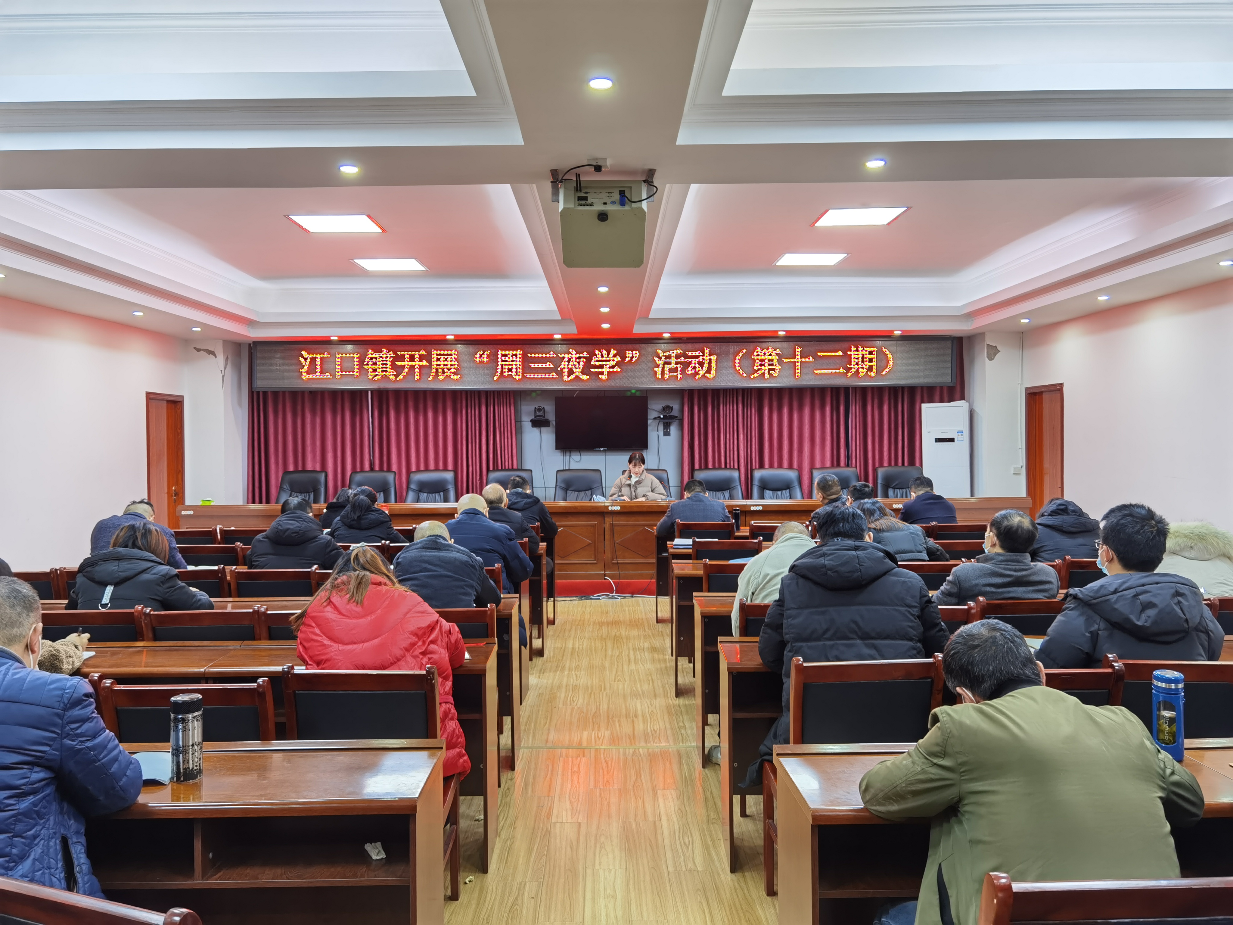 11月24日晚,江口镇组织全体镇干部集中开展了“周三夜学”(第十二期),由副镇长魏杭再次领学了党的十九届六中全会精神,选学了《中华人民共和国简史》《改革开放简史》《社会主义发展简史》的部分章节。