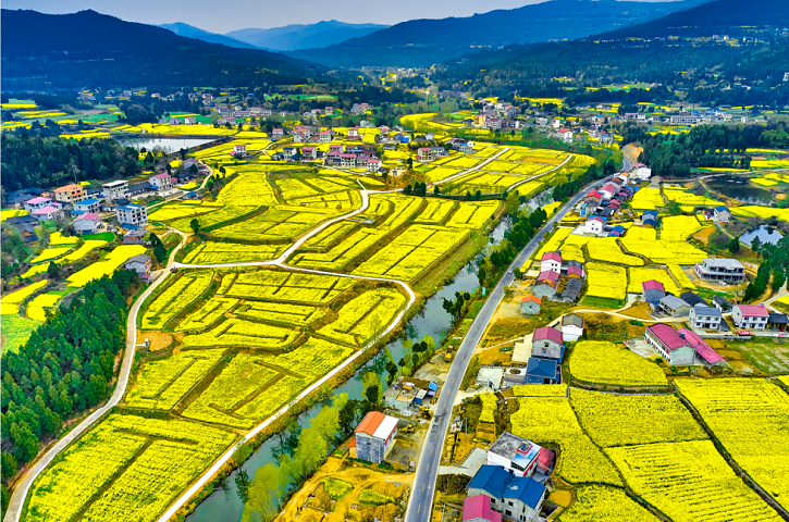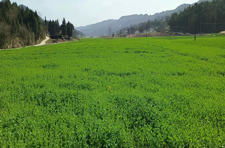 初春,在剑阁县杨村镇田间地头,碧绿的油菜田里点缀着点点黄花。