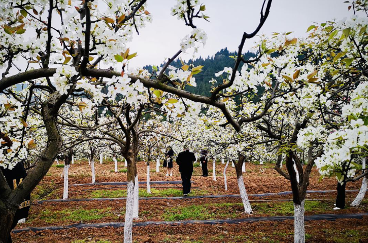 走在梨园种植区,眺望远方,只见一树树梨花已经开放,成林成片,如玉似雪,争相传递着春的讯息。沿着村道一路前行,道路两旁的梨花有的含苞待放,有的已经盛开,洁白的梨花在高大的梨树上随风摇曳,一簇簇、一团团压满枝头,一幅春意满满的画卷,风从花海深处出来,从半山腰吹来,带来阵阵花香。梨花树下,有些游客拍花,有些游客摆造型拍照,享受着春天的馈赠和花的盛宴。