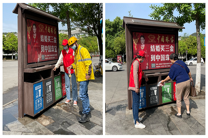 垃圾桶前,讲解有害垃圾的危害,引导群众将垃圾分类投放。