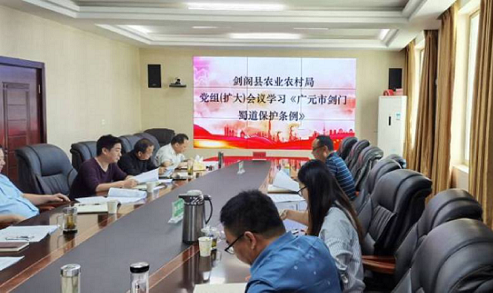 “蜀道咽喉、川北门户,剑门蜀道文化底蕴深厚,境内古道、古柏等自然遗迹众多。刚刚学习的《广元市剑门蜀道保护条例》(以下简称条例)把蜀道景观、文化遗产的保护和传承以及损毁责任等进行了明确和规范。有了《条例》,蜀道遗址遗迹科学保护、充分利用、绿色发展将迎来新的历史机遇。”5月6日上午,在农业农村局领导党组(扩大)会议上,由局党组书记、局长罗映波领学《条例》,局党组成员和领导班子以及部分站股负责人参加学习。