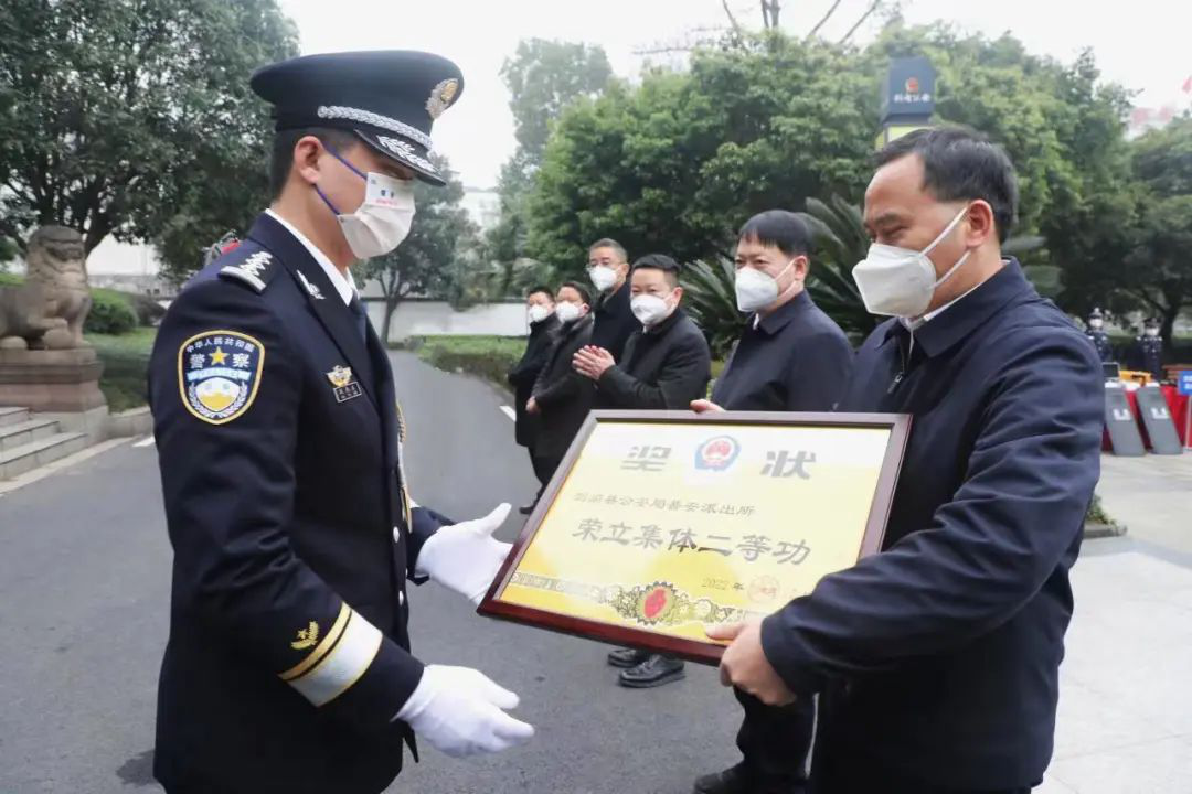 仪式上,杨祖斌代表县四套班子向受到表彰的先进集体和先进个人表示热烈祝贺!向忠诚守护剑阁的广大公安干警致以节日的问侯和崇高的敬意!并为党的二十大安保维稳工作中取得突出成绩、获得集体二等功的普安派出所颁发奖牌,为2022年度个人三等功的8名同志佩戴奖章。全体警员举行迎警旗、宣警誓活动。