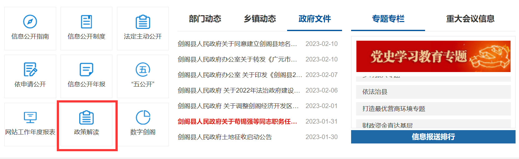 2022年,剑阁县人民政府聚焦全县经济社会发展重点、紧盯社会民生难题,严格遵循《中华人民共和国政府信息公开条例》,认真抓好全县政府信息公开工作。始终坚持以公开为常态、不公开为例外,持续拓展信息公开范围、不断深化信息公开内容、积极完善工作机制,高效保障信息发布时效,高质量提升全县政府信息公开动作水平。
