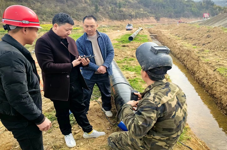 图为:县水利局检查杨家河供水工程(水厂)管网铺设