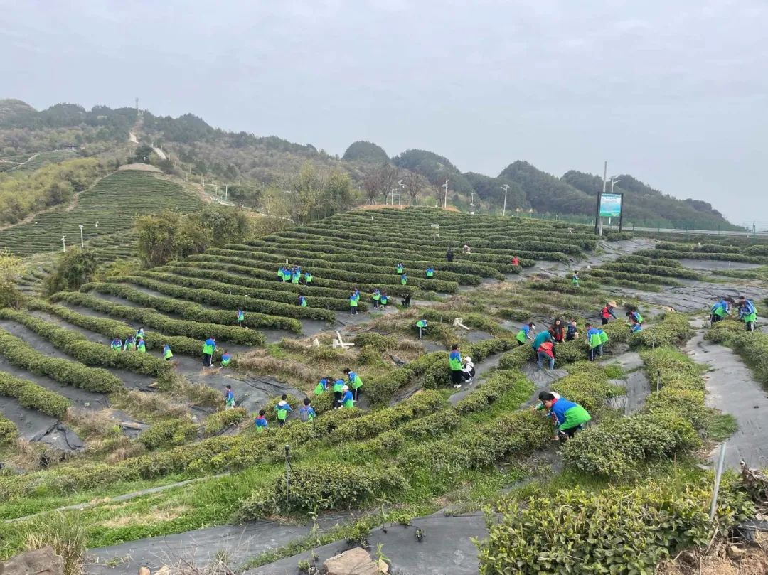 雨过天晴的剑门关仙峰观剑门·蜀道茶旅生态公园,二千多亩郁郁葱葱的茶树一畦畦宛若绿色的丝带飘舞在剑门七十二峰之间,青翠欲滴,枝枝新芽嫩绿芳香怡人,采茶工们栖身于茶丛中,灵巧的双手在树枝上和竹蒌间来回翻飞,茶园一片繁忙景象。来自县内几所小学的师生也来这里开展研学活动,孩子们感受茶文化,学习茶叶采摘,听取“茶山变金山”的故事,现场一片欢声笑语。