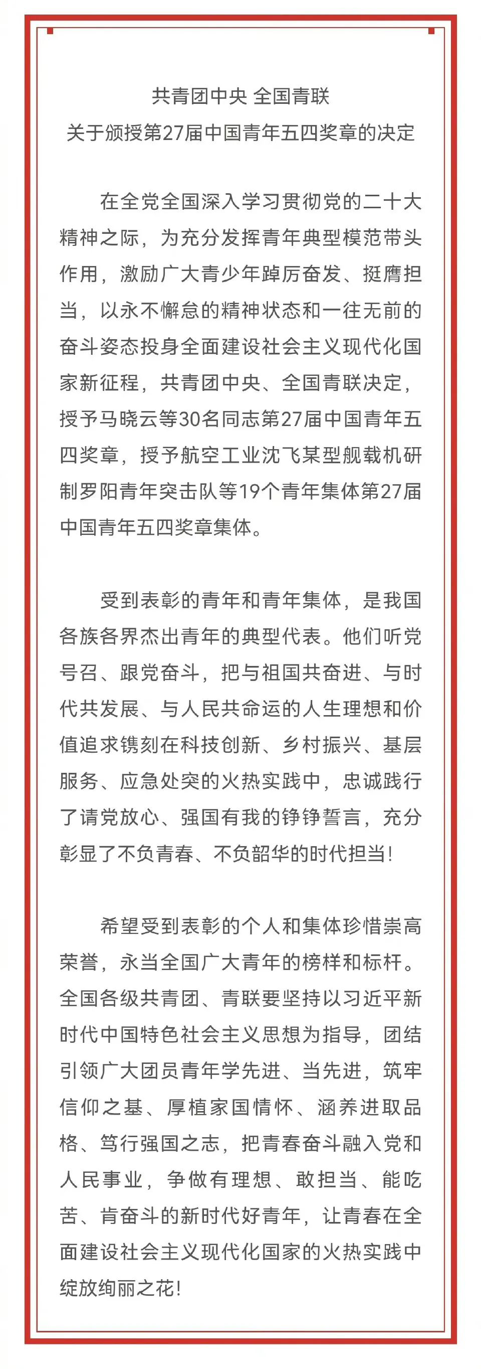 受到表彰的青年和集体是新时代青年的杰出代表、是全国广大青年学习的榜样。他们把与祖国共奋进、与时代共发展、与人民共命运的人生理想和价值追求,镌刻在科技创新、乡村振兴、基层服务、应急处突的火热实践中,忠诚践行了请党放心、强国有我的铮铮誓言,充分彰显了不负青春、不负韶华的时代担当。