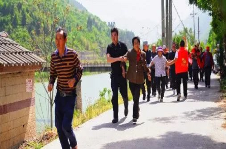 在下寺镇桅杆村,村组干部一边奔跑一边敲锣呼喊:“各位乡亲,房后的山要滑坡了,大家赶快疏散逃生,向临时避险安置点转移!”乡亲们在村组干部的引导下或搀扶、或背负,迅速撤离到临时避险安置点。
