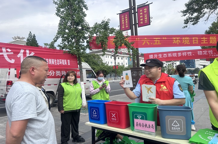 2023年6月5日是第52个世界环境日,为倡导居民们时刻践行生态环保意识,提升低碳生活理念,了解垃圾分类益处,形成人人参与垃圾分类的环保氛围。广元市生活垃圾分类中心、剑阁县综合行政执法局、广元绿港环境发展有限公司以“建设人与自然和谐共生的现代化”为主题,开展“环境保护在心中,垃圾分类在手中”的宣传活动。