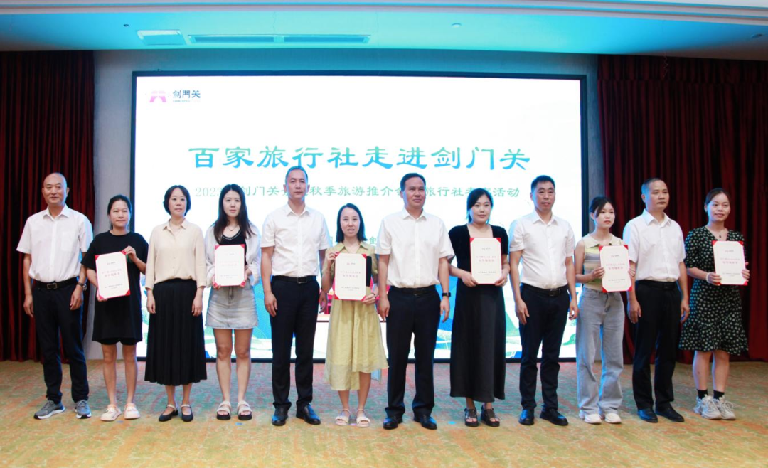 推介会上,剑阁县向四川百事通国际旅行社有限公司、四川乐游假期国际旅行社有限公司、成都携程国际旅行社有限公司等6家旅行社代表颁发“剑门关旅游推荐店”证书。