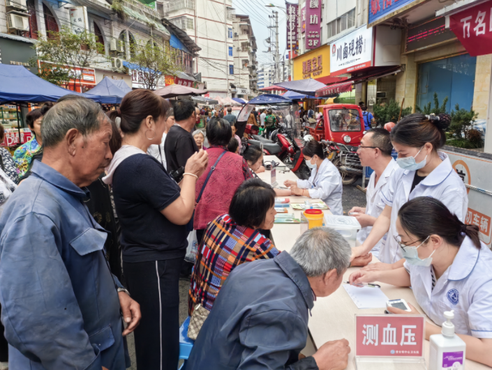 该院组织内科、外科、全科、妇科、临床护理、公卫科等科室医务骨干,由业务副院长带队组成义诊志愿服务团队,携带血压计、血糖仪等医疗设备为前来参加的群众进行免费血压、血糖监测以及药物使用指导、心肺听诊、慢性病管理、健康知识宣传,并对群众进行了个性化的健康指导。